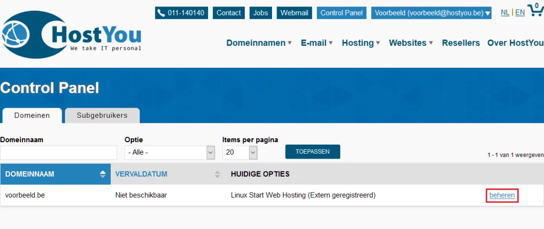 Via de Inloggen pagina op de HostYou website komt u op uw Control Panel terecht met een lijst van alle domeinnamen die u bij HostYou heeft.