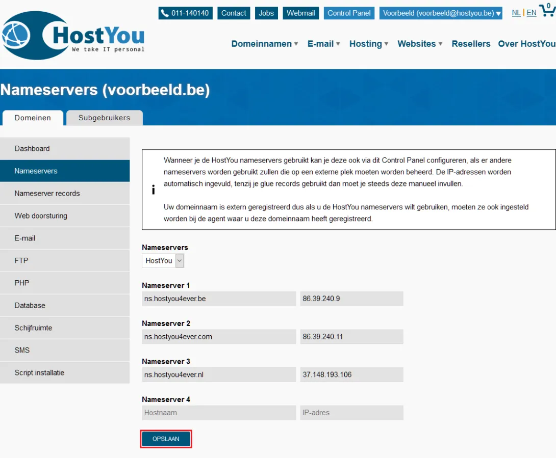 U kan de HostYou nameservers gratis gebruiken, of u kan eigen nameserver of die van derden ingeven. Wanneer niet de HostYou nameservers worden gebruikt, moeten de instellingen van deze externe nameservers ook elders worden beheerd.